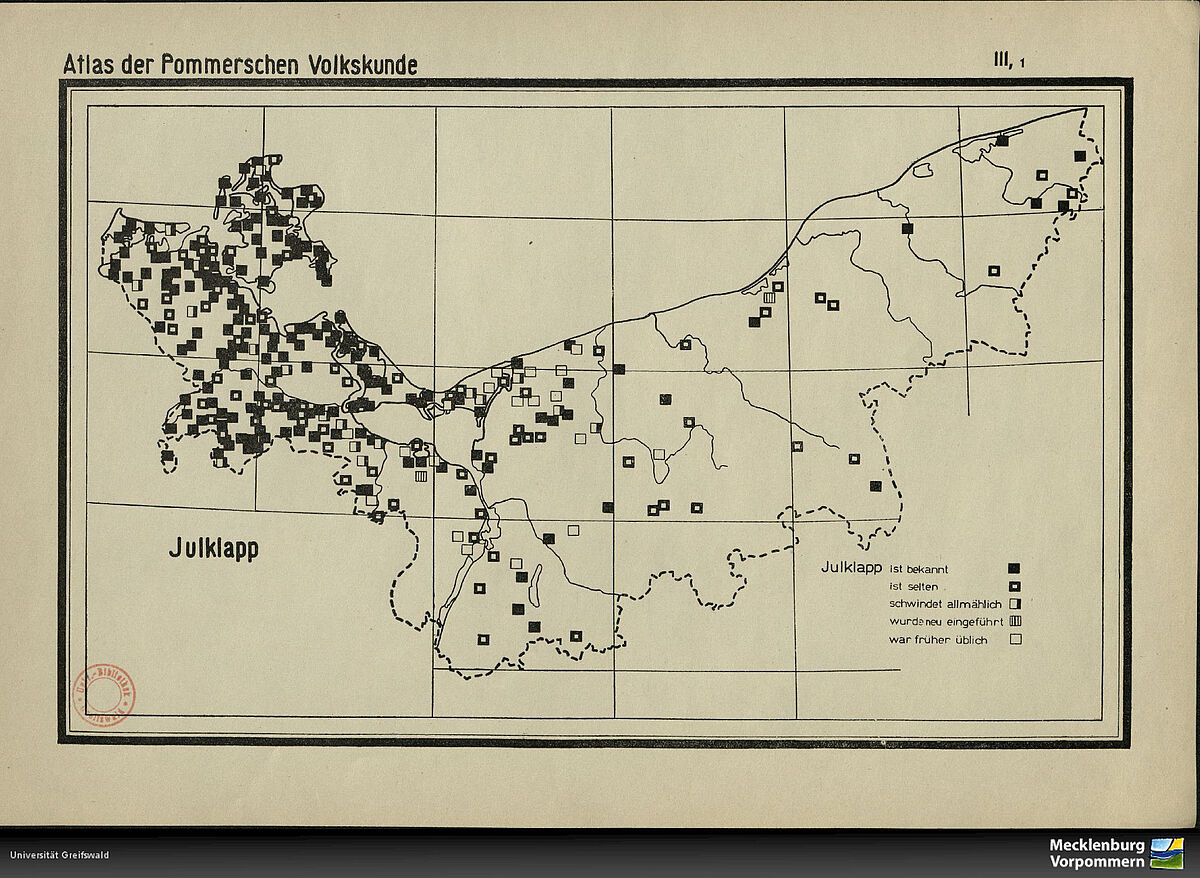 Der beliebte Weihnachtsbrauch, bei dem innerhalb einer Gruppe anonym ausgelost wird, wer wen beschenkt, hat seine Wurzeln in Skandinavien. Dort hieß er ursprünglich „Julklapp“ – zusammengesetzt aus Jul (Weihnachten) und klapp (klopfen). In Schweden wurde das folgendermaßen gemacht: Das Geschenk wurde vor die Tür gelegt, es wurde laut angeklopft und anschließend rannte der Schenkende weg, um unerkannt zu bleiben. Laut dem „Atlas der Pommerschen Volkskunde“, zu finden in der Digitalen Bibliothek MV, war dieser Brauch auch bei uns weit verbreitet. Kein Wunder, denn unsere Region gehörte von 1648 bis 1815 zu Schweden.