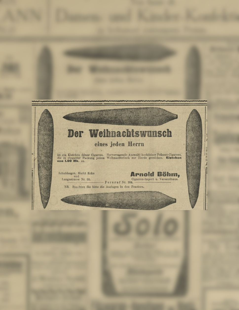 Und 1910? Laut der Greifswalder Zeitung konnte man in der Marktstraße 3 Batist Tücher, also feine Stofftücher, zu einem speziellen Weihnachtspreis erwerben. In „Schuhhagen, Markt Ecke und Langestrasse Nr. 55“ gab es „Kistchen feiner Cigarren“. Was habt ihr euch als Kinder zu Weihnachten gewünscht?