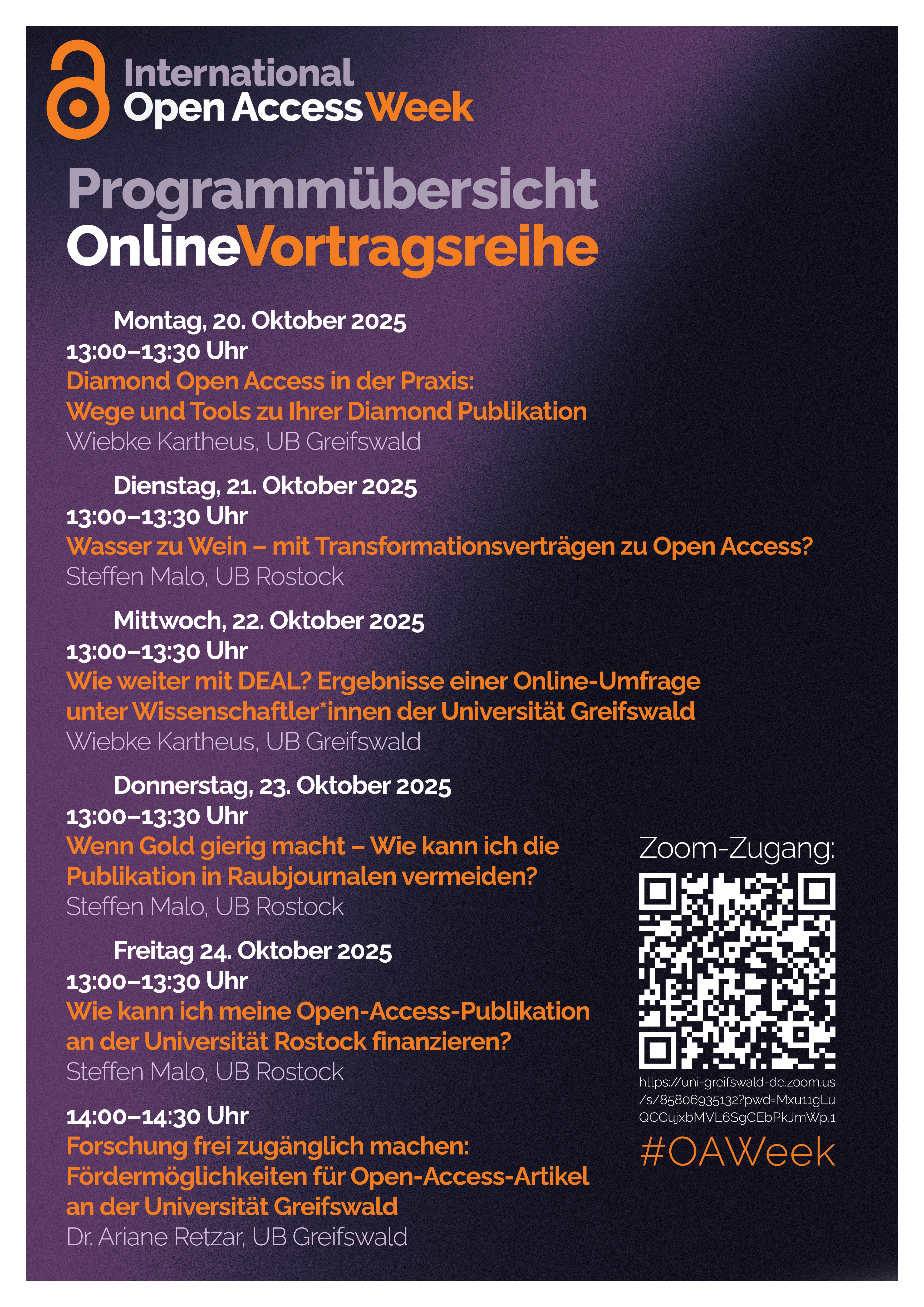 Who Owns Our Knowledge? – Ganz nach dem diesjährigen Motto „Wem gehört unser Wissen?“ stellen die Universitätsbibliothek Rostock und Universitätsbibliothek Greifswald Infos rund um Diamond und Gold Open Access, Transformationsverträge oder allgemeine Hinweise zur Förderung von Open-Access-Publikationen in der International Open Access Week 2025 bereit.